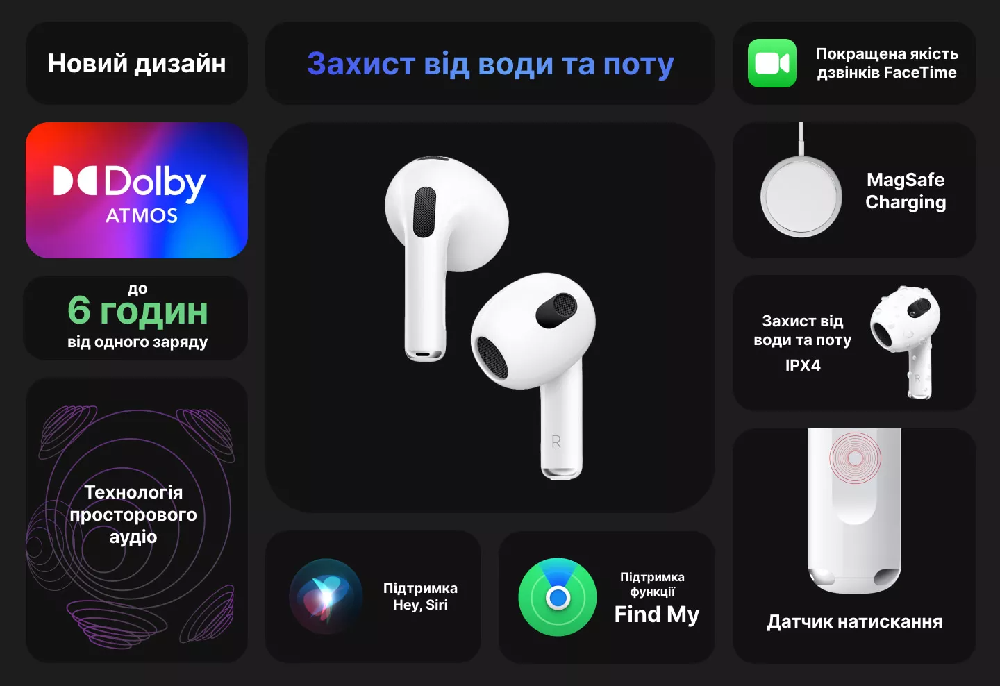 У нових Apple AirPods 3 дизайнери та інженери з Купертіно зробили акцент на покращенні звучання та комфорту. Завдяки підтримці технології просторового аудіо, слухач може зануритися у звук так, ніби знаходиться в кінотеатрі, з ефектом об’ємного звучання навколо.
